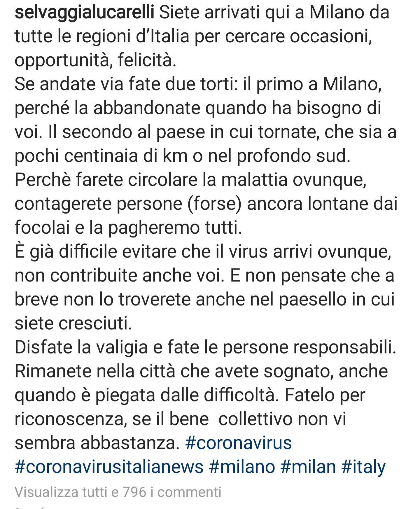 Condivido al 100% quello che scrive Selvaggia Lucarelli: non fuggite da Milano, non fuggite dalla Lombardia. È un gesto irresponsabile che contribuisce alla diffusione del coronavirus in altre regioni e luoghi del nostro paese. Non muoviamoci, atteniamoci alla profilassi indicata e soprattutto cerchiamo di non uscire di testa perché non solo non ce ne sono le ragioni ma diamo un esempio davvero pessimo.