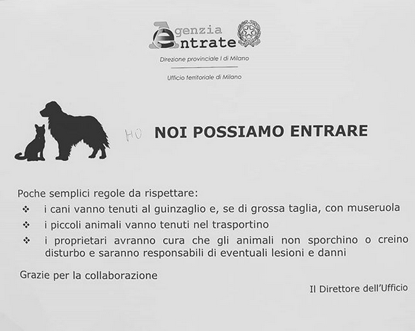 Agenzia delle Entrate, Milano. Tre ore abbondanti di coda per avere un pin, un altro degli effetti collaterali del coronavirus. Gli uffici aprono alle 9 anziché 8:30, dopodiché fanno entrare 15 persone alla volta nel palazzo e 7 alla volta agli sportelli veri e propri. Una volta entrati, lo scenario è contraddittorio e quindi confortante: alcuni impiegati sono in assetto da guerra batteriologica (mascherine e guanti di lattice, ti tengono a distanza di sicurezza), altri molto tranquilli con un normale look da lavoro senza optional Covid-19. Devo dire che, nonostante l’esasperante lentezza, nessuna delle tante persone in coda ha dato in escandescenza, lo trovo un segno di civiltà e responsabilità. Faccio un appunto: perché, anziché indossare mascherine che non servono a niente, non si iniziano ad installare in tutti gli uffici pubblici dispenser con gel antibatterico come negli ospedali? A prescindere dal Covid-19. Ad ogni modo, il fatto che l’Agenzia delle Entrate consenta l’ingresso di animali non può che addolcire le mie polemiche. È, anche questo, un segno di civiltà.