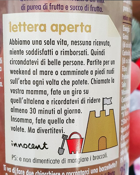 Mi sono appena bevuta uno smoothie al mango, un modo un po’ più figo per dire “centrifuga”. Era buonissimo, e l’ho preso tra l’altro al supermercato non in un chiosco chic a Central Park. Stavo per buttare la bottiglietta nel raccoglitore della plastica quando l’occhio mi è cascato sull’etichetta. “Lettera aperta”, c’è scritto. Beh, leggetela questa lettera, è bellissima. La marca dei succhi di frutta è @innocent, è una azienda italiana con sede a Milano. Bravi, perché l’idea di packaging e comunicazione è semplice e bella ed il prodotto merita. Mai come in questi giorni abbiamo bisogno di belle storie, anche piccole.